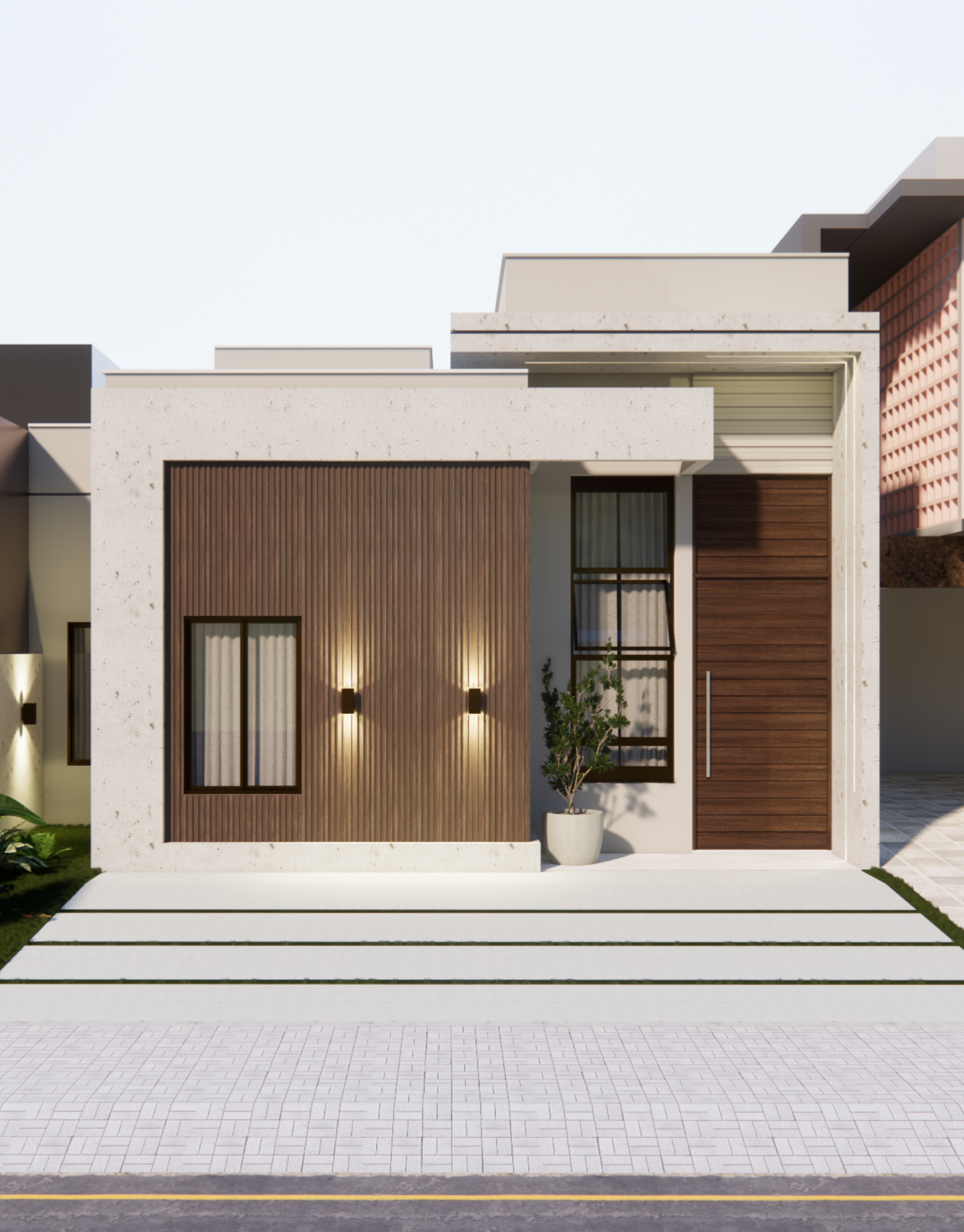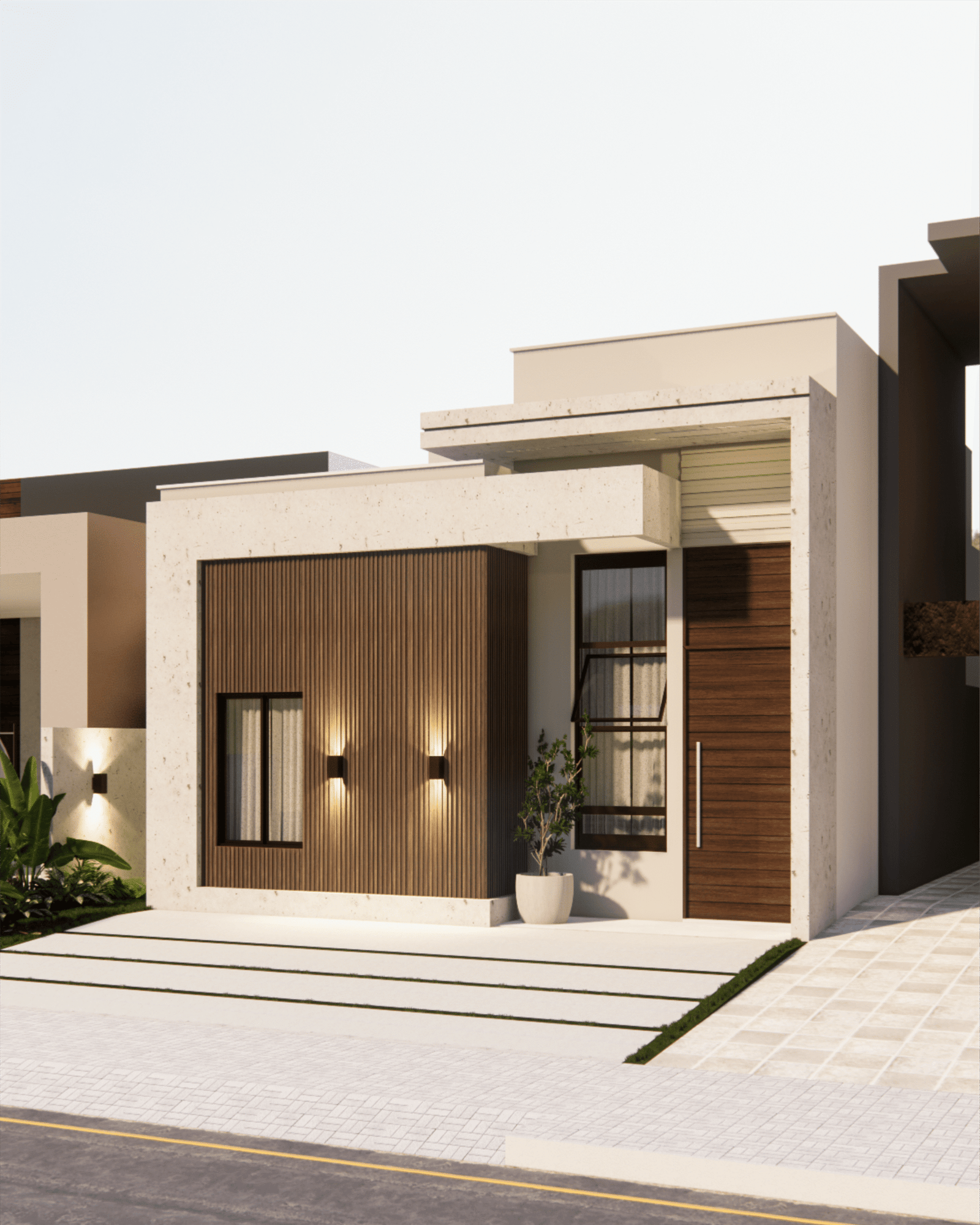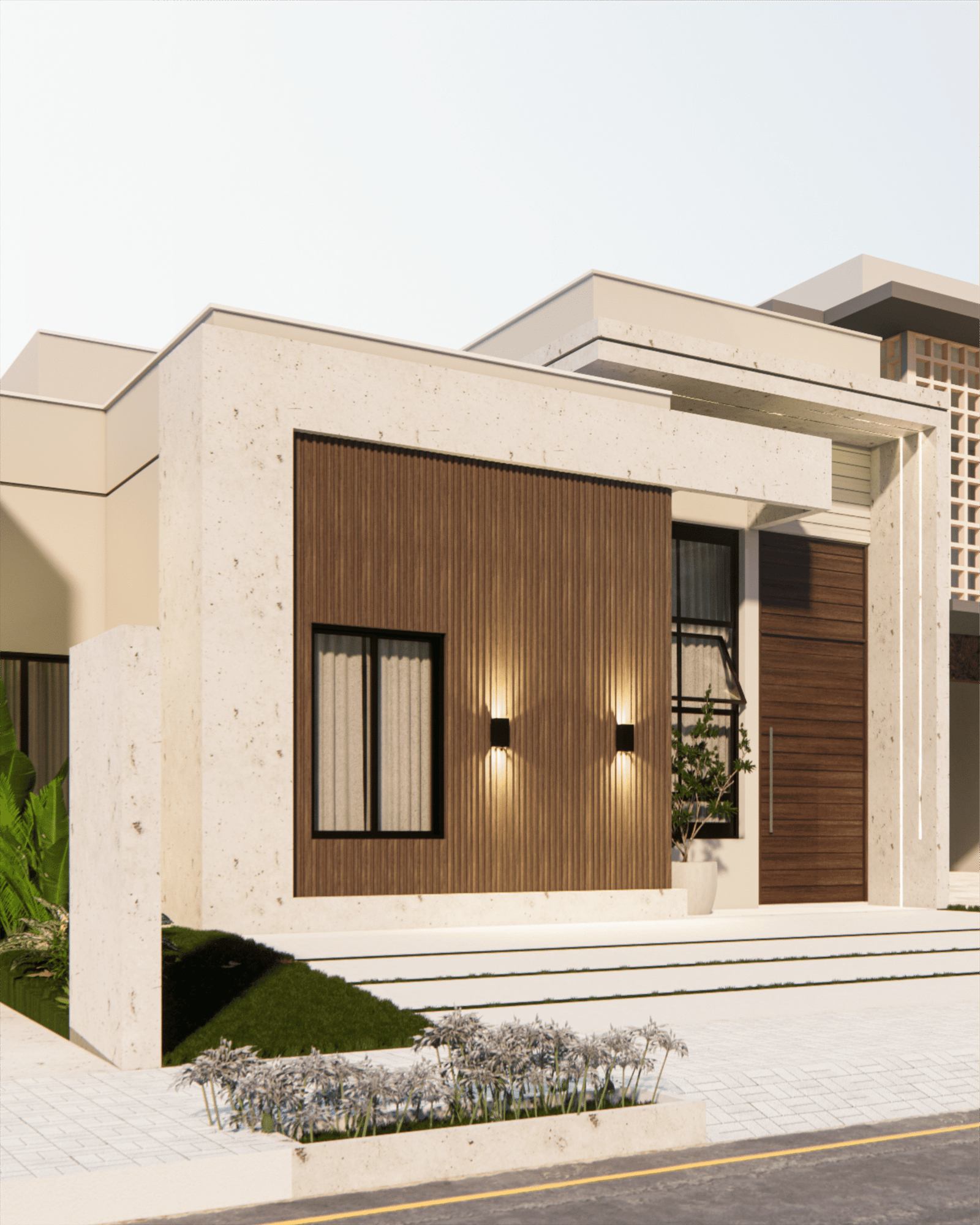 A casa âmbar destaca as linhas retas, os ângulos marcantes e a arquitetura em blocos bem definida. Esse projeto valoriza o design sem excessos com o tom quente e acolhedor que a iluminação das arandelas projeta sobre o painel de madeira ripada.