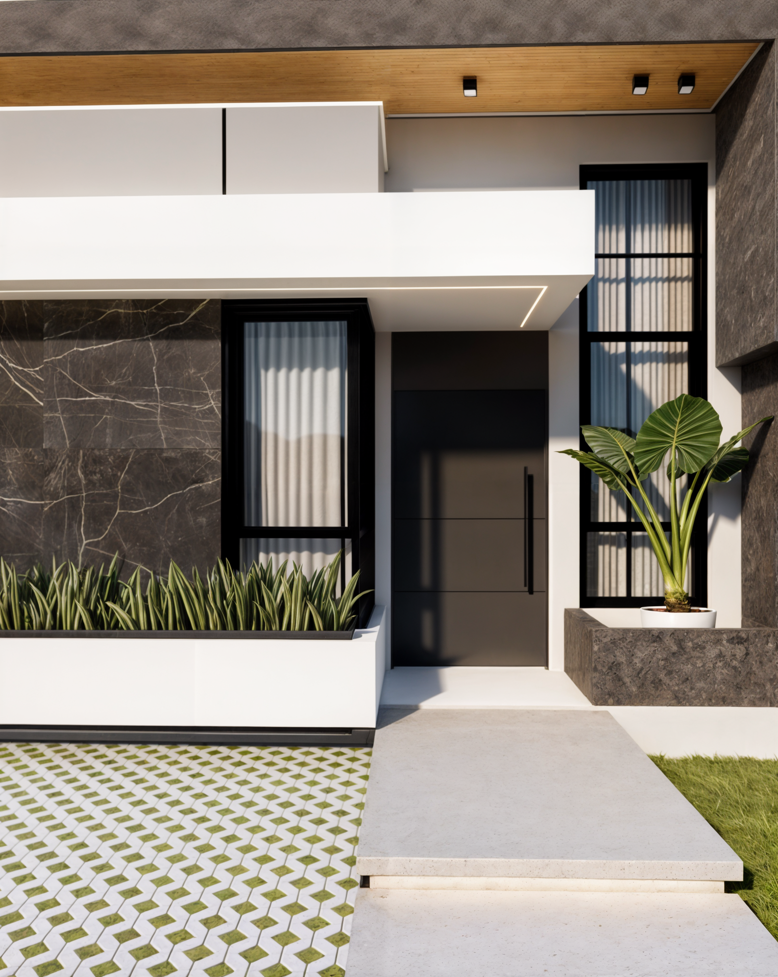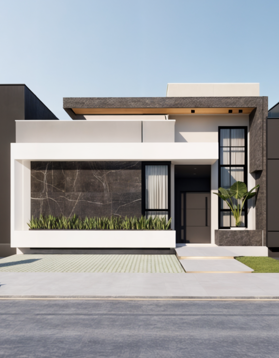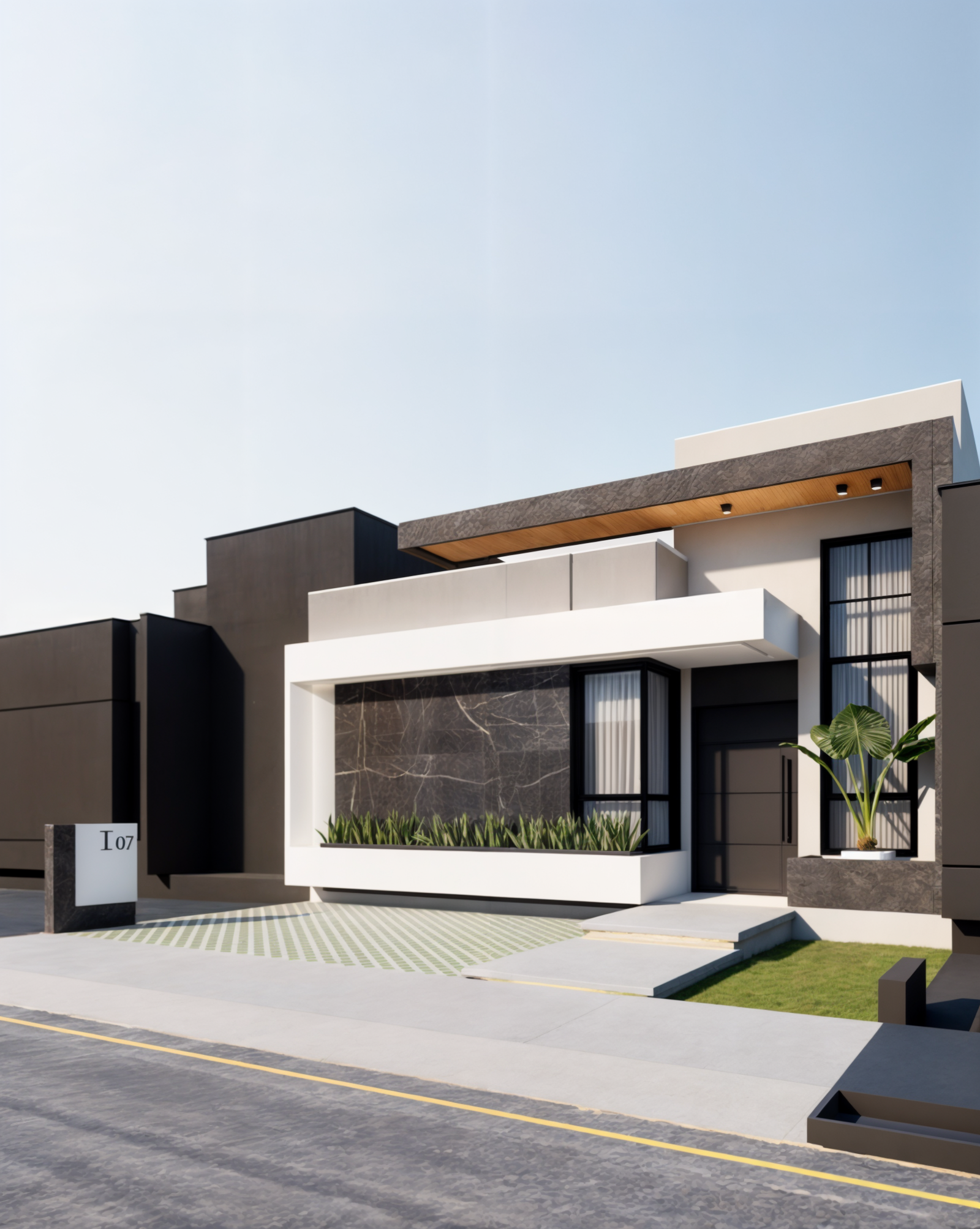 Referência à pedra preciosa escura, a casa ônix remete ao painel de mármore preto que é o grande destaque visual dessa residência. Essa fachada traz um contraste muito intenso e uma sofisticação marcante. O uso do preto profundo, o mármore escuro com veios brancos e os detalhes em madeira no forro criam um design imponente e luxuoso.