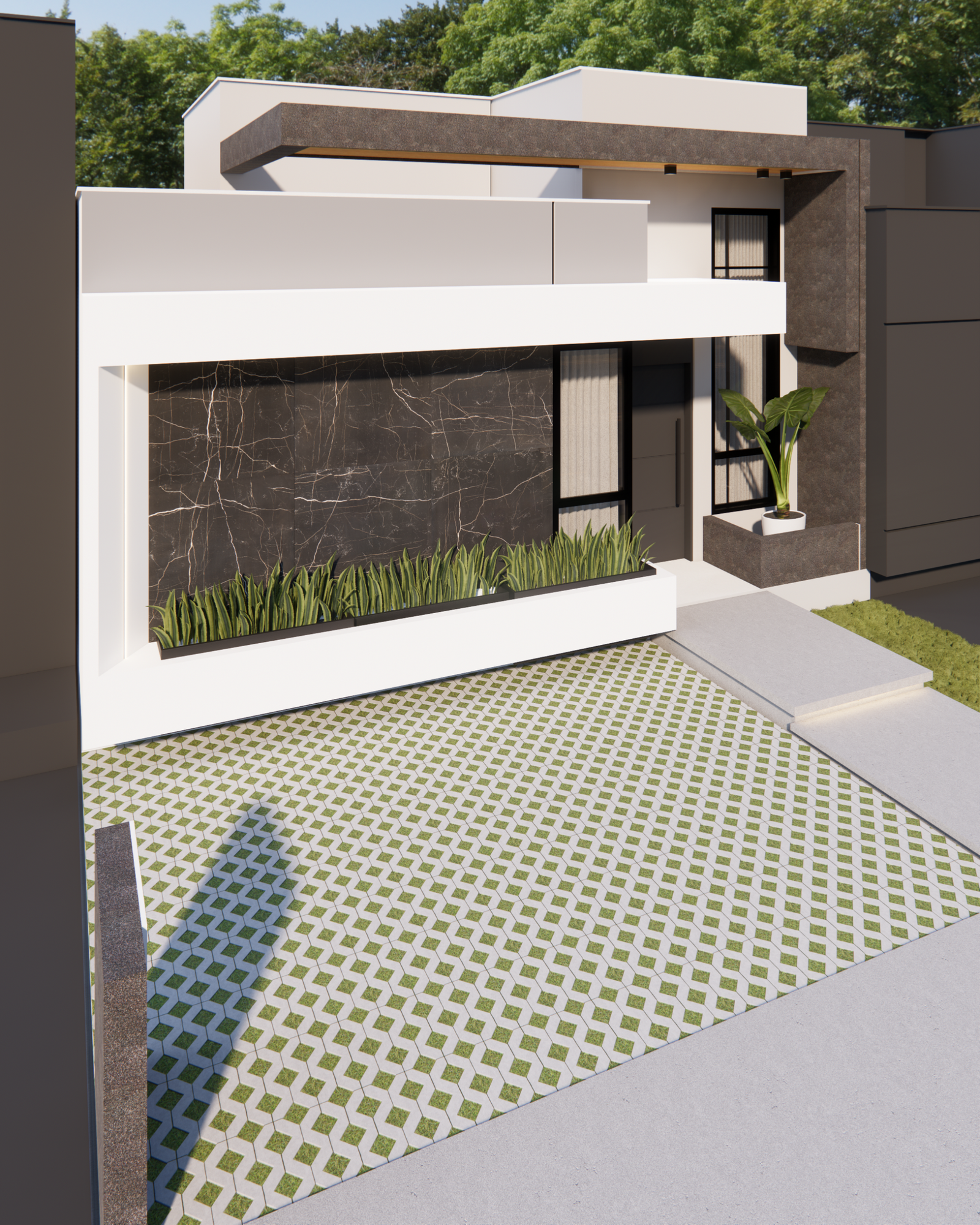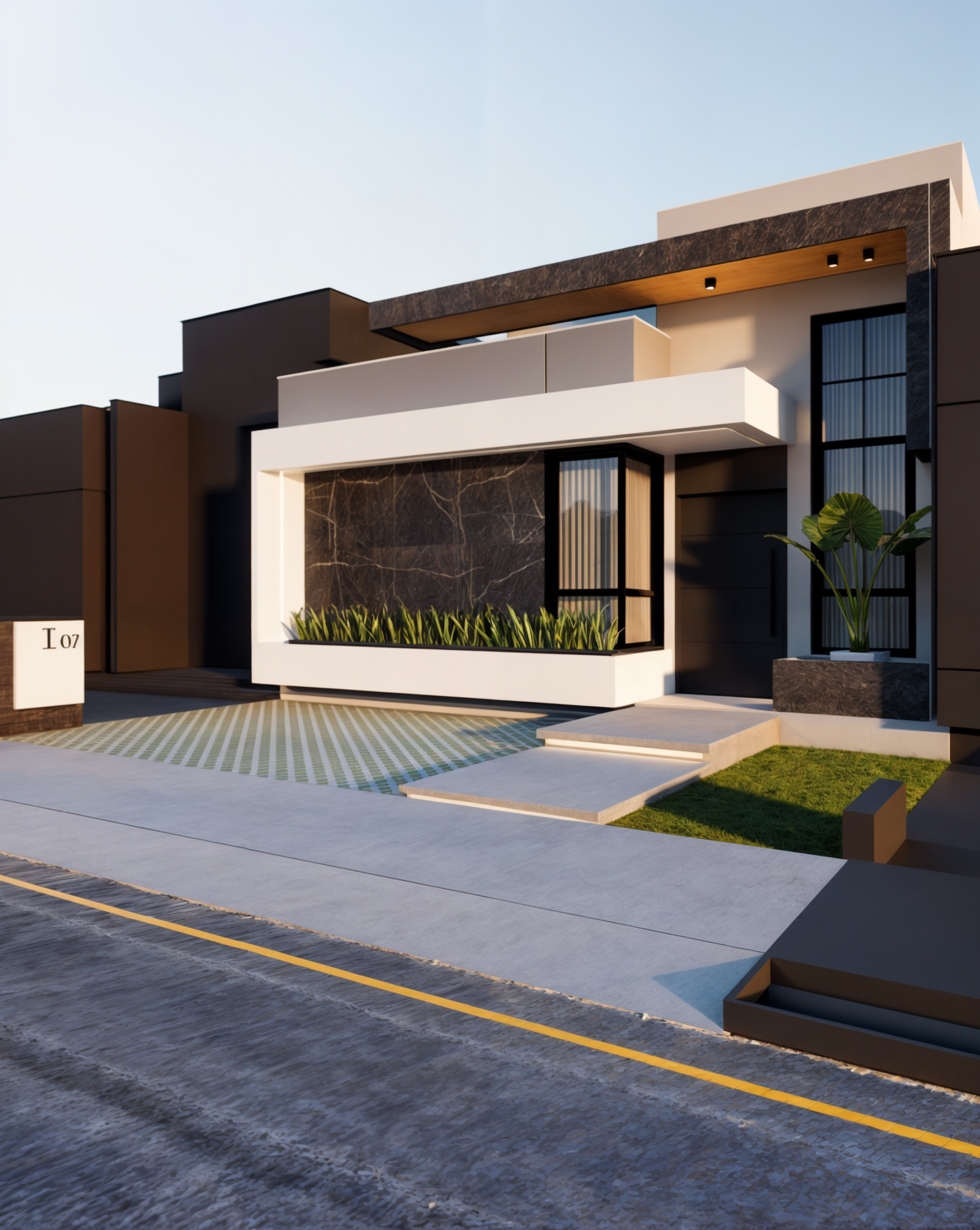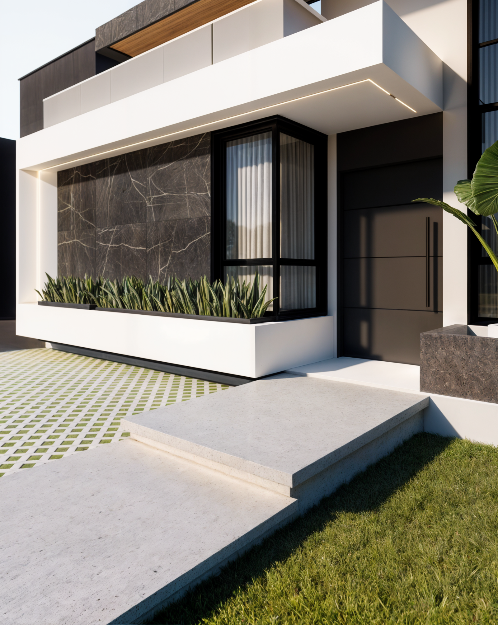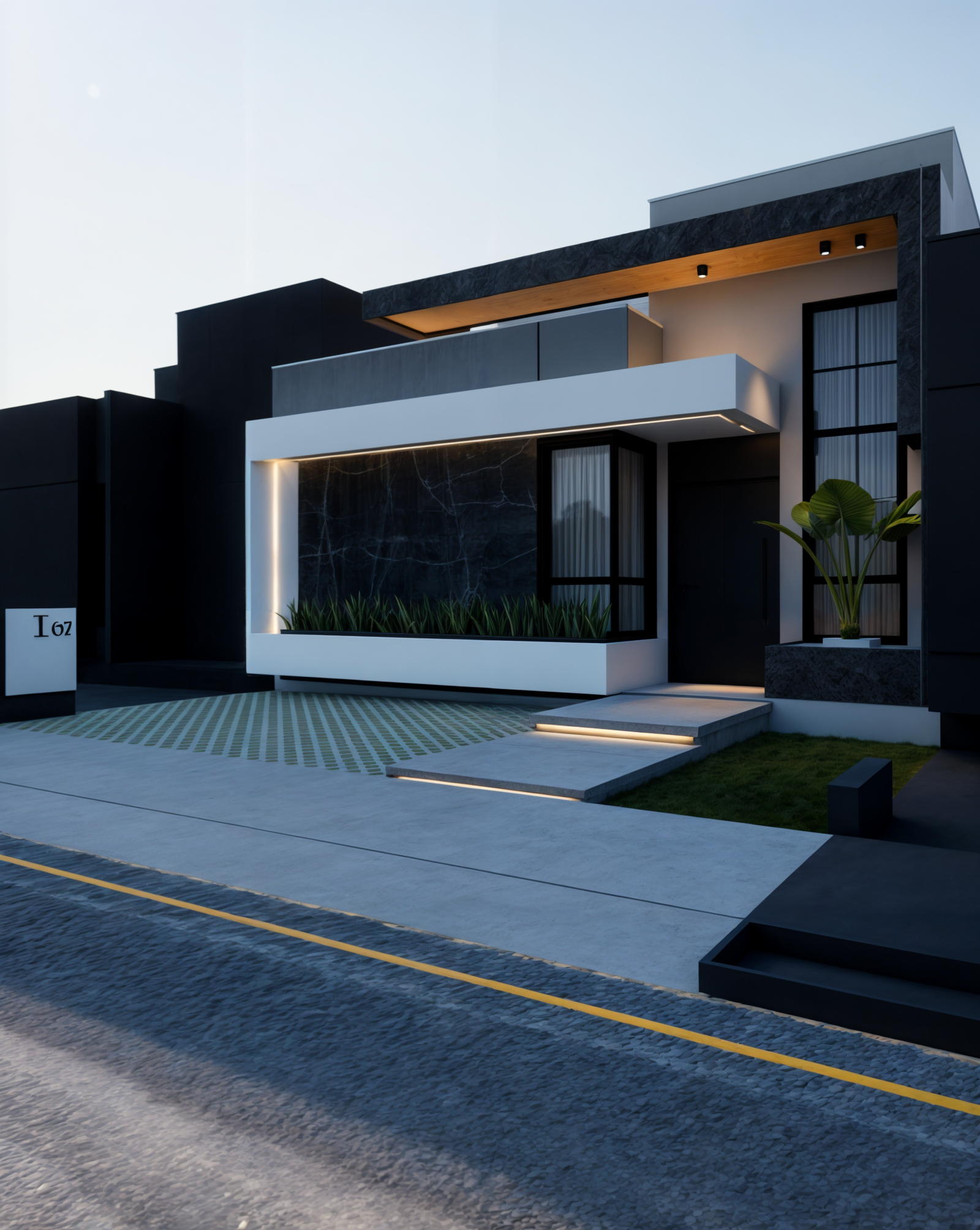 Referência à pedra preciosa escura, a casa ônix remete ao painel de mármore preto que é o grande destaque visual dessa residência. Essa fachada traz um contraste muito intenso e uma sofisticação marcante. O uso do preto profundo, o mármore escuro com veios brancos e os detalhes em madeira no forro criam um design imponente e luxuoso.
