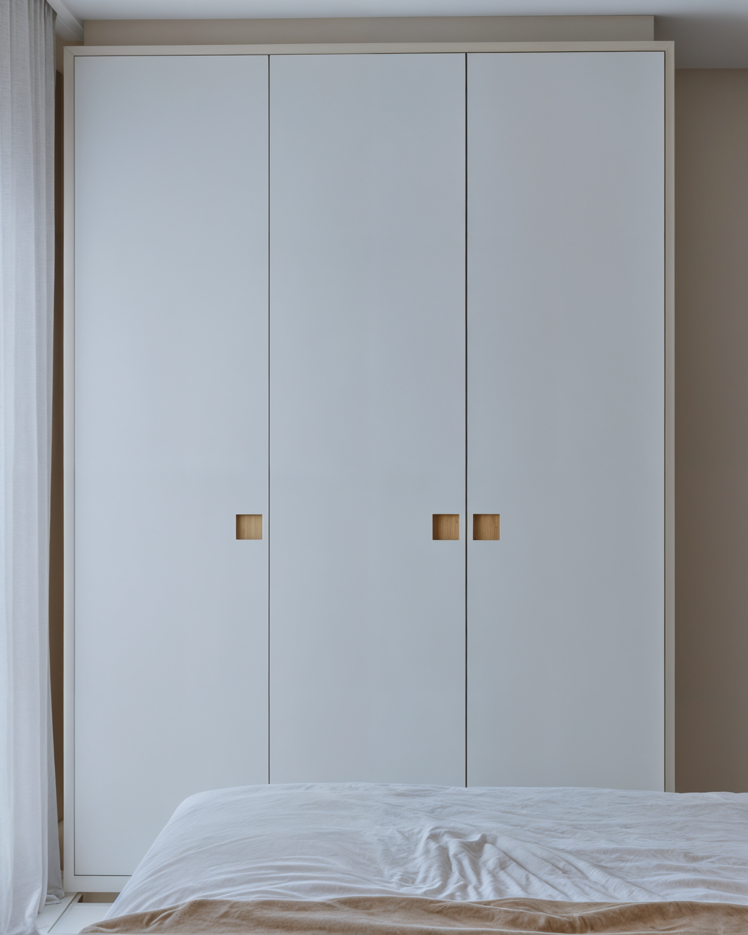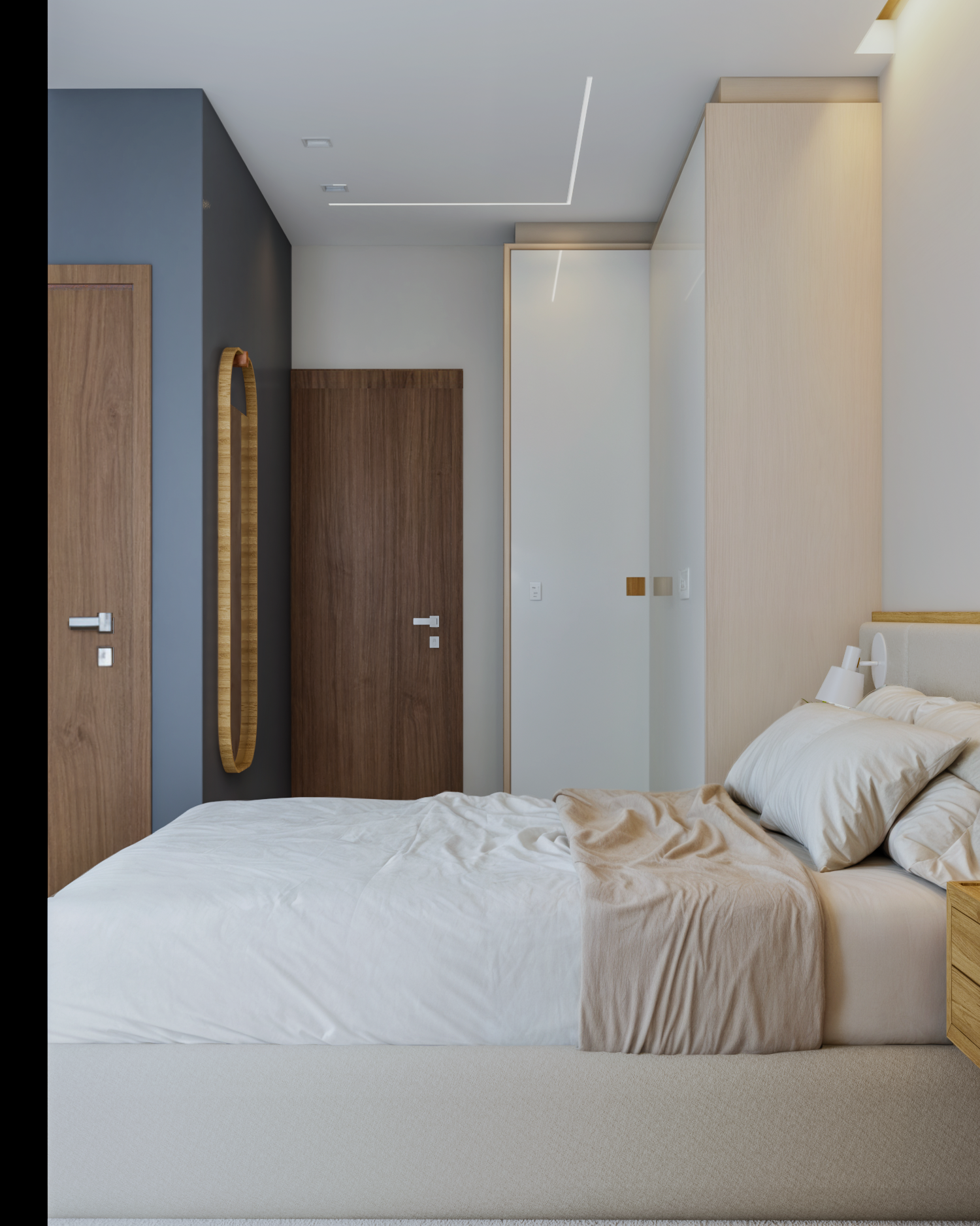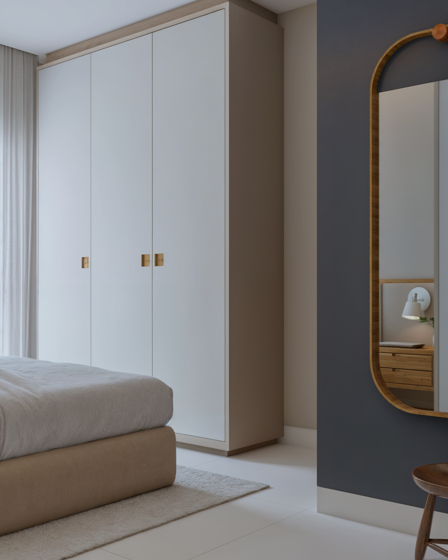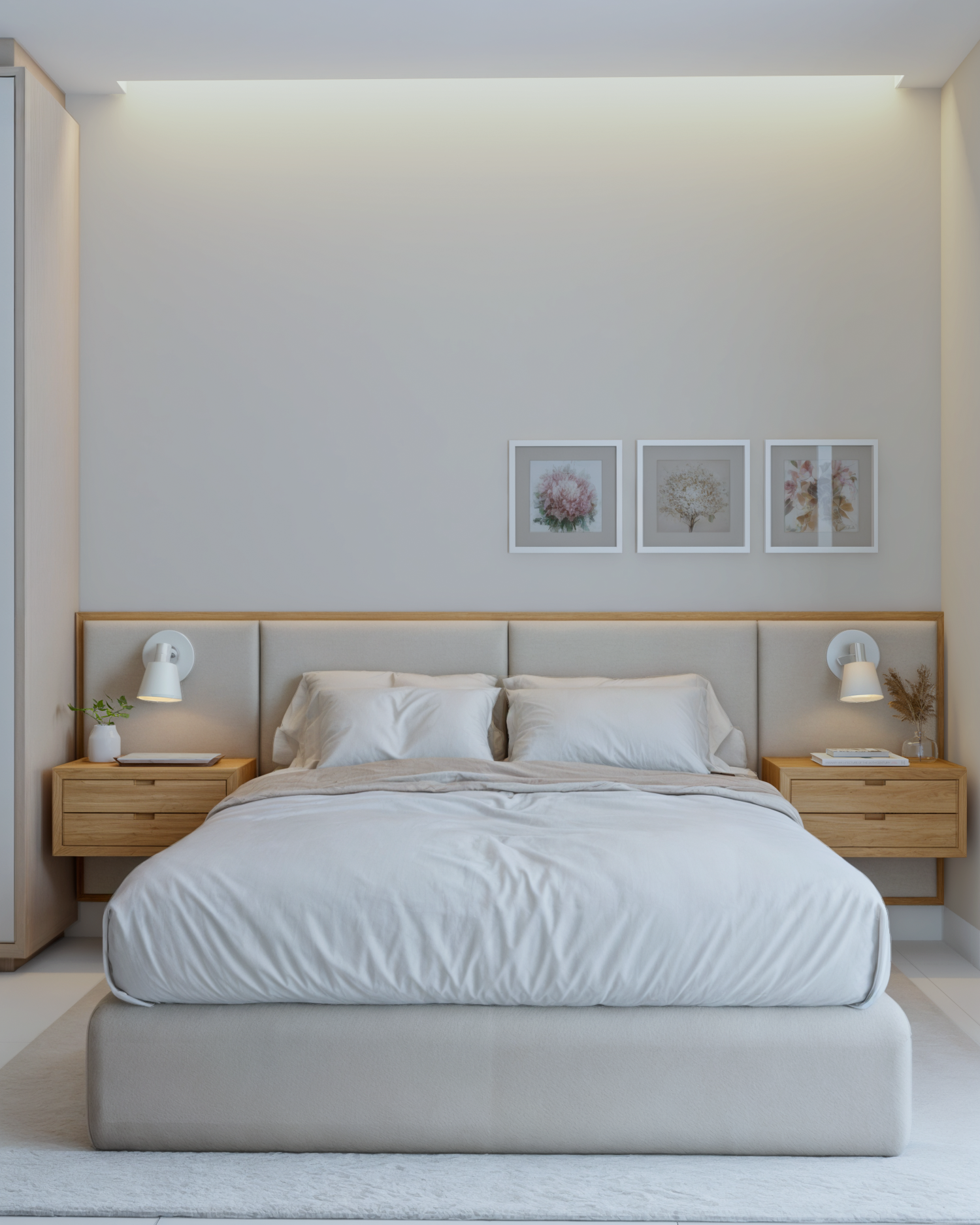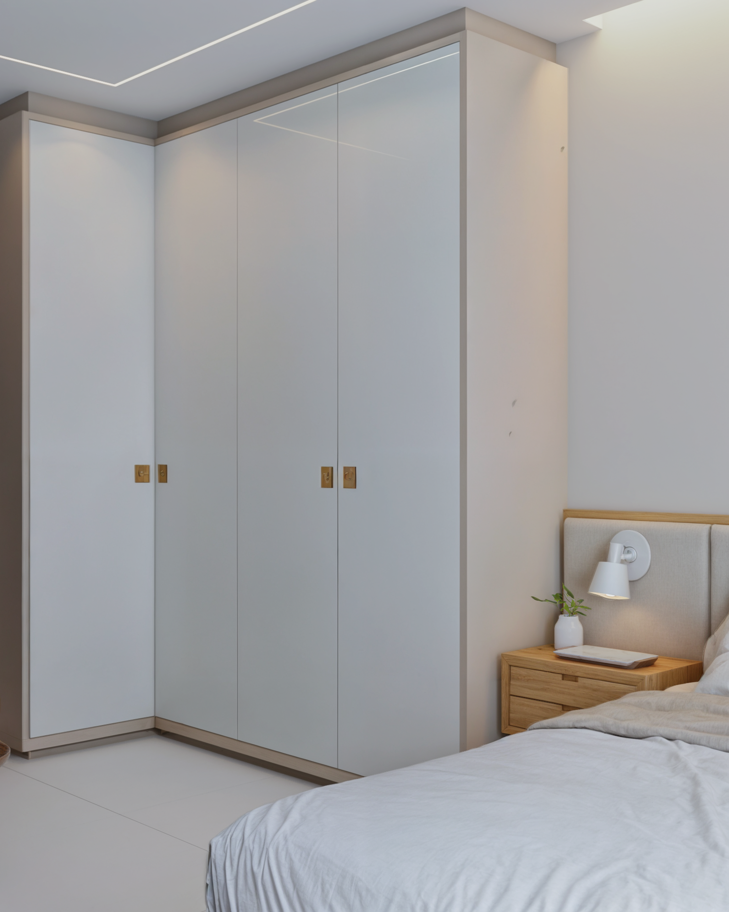 Nesse projeto temos bastante roupeiro. Para que a quantidade de armários não pesasse no espaço, optamos por uma paleta neutra e clara. Como resultado, temos uma suíte super aconchegante e um ambiente tranquilo. Destaque para essa cabeceira lindíssima e para essa iluminação quente e indireta na sanca logo acima da cama do casal.