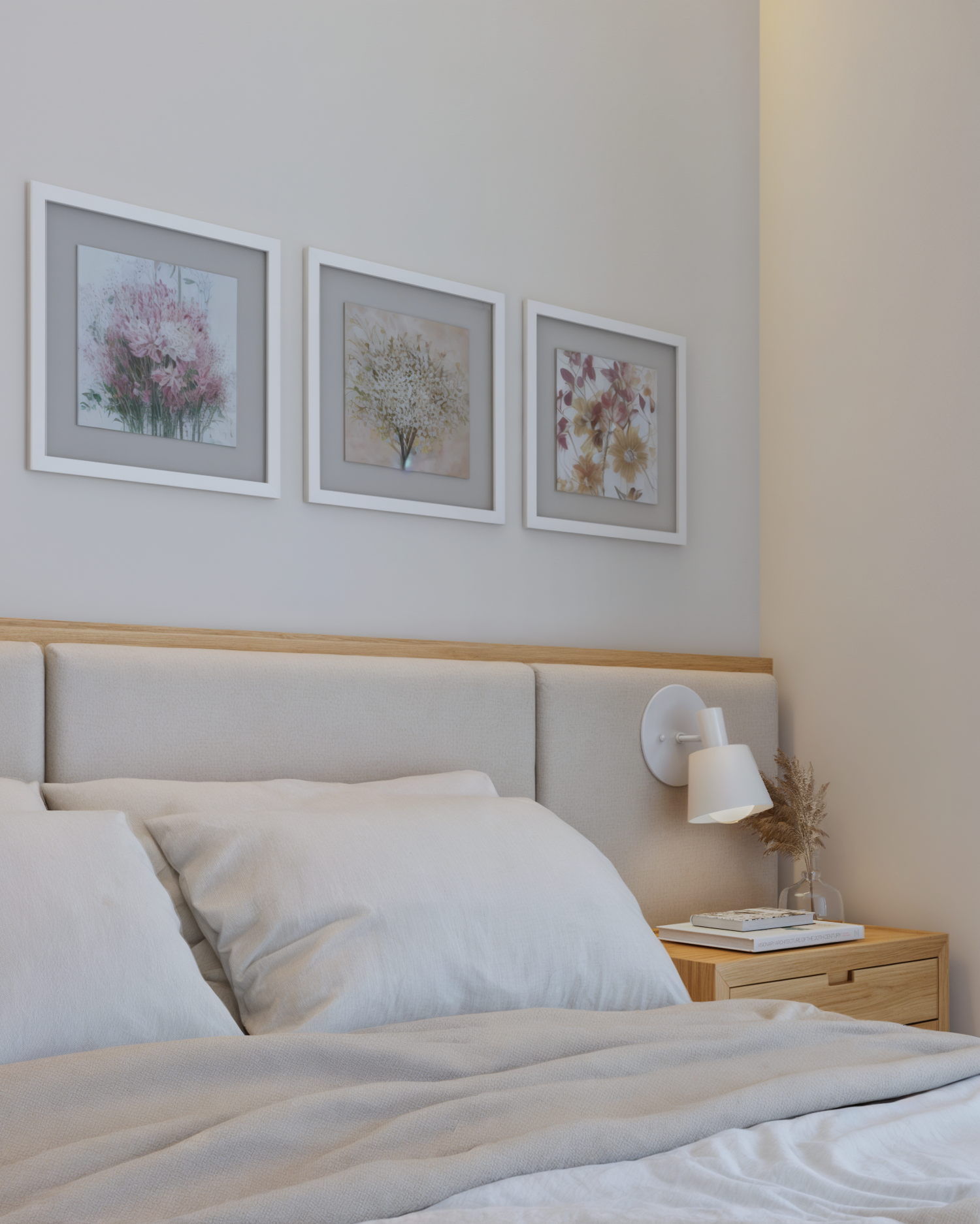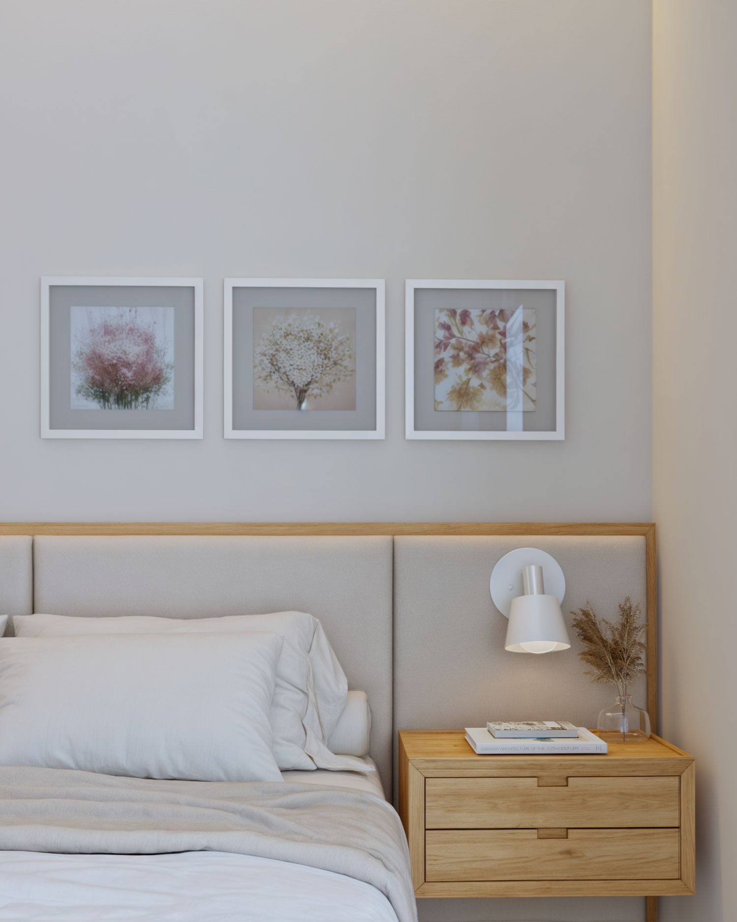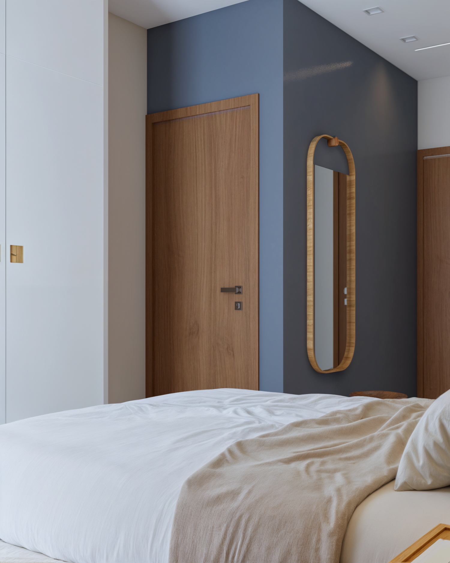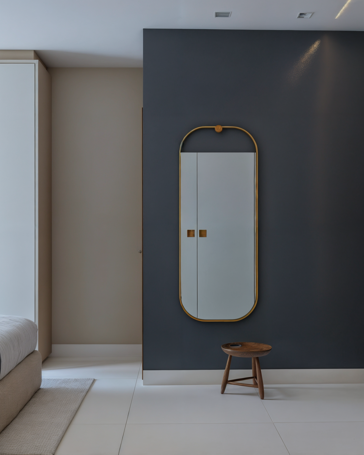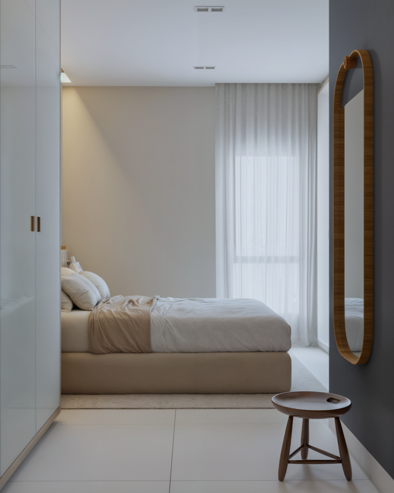 Nesse projeto temos bastante roupeiro. Para que a quantidade de armários não pesasse no espaço, optamos por uma paleta neutra e clara. Como resultado, temos uma suíte super aconchegante e um ambiente tranquilo. Destaque para essa cabeceira lindíssima e para essa iluminação quente e indireta na sanca logo acima da cama do casal.